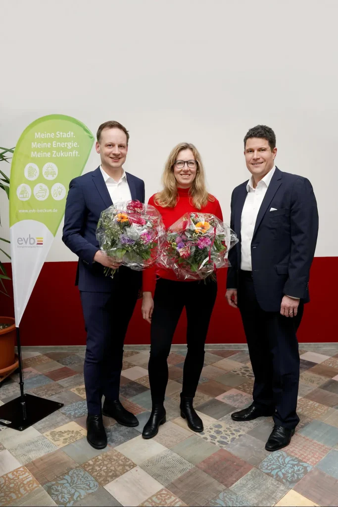 Bildunterschrift: Auf dem Bild zu sehen von links: Nicolas van Kevelaer, AR-Vorsitzender der Energieversorgung Beckum, Saskia Kemner, stellvertretende AR-Vorsitzende, Daniel Dierich, Geschäftsführer der Energieversorgung Beckum